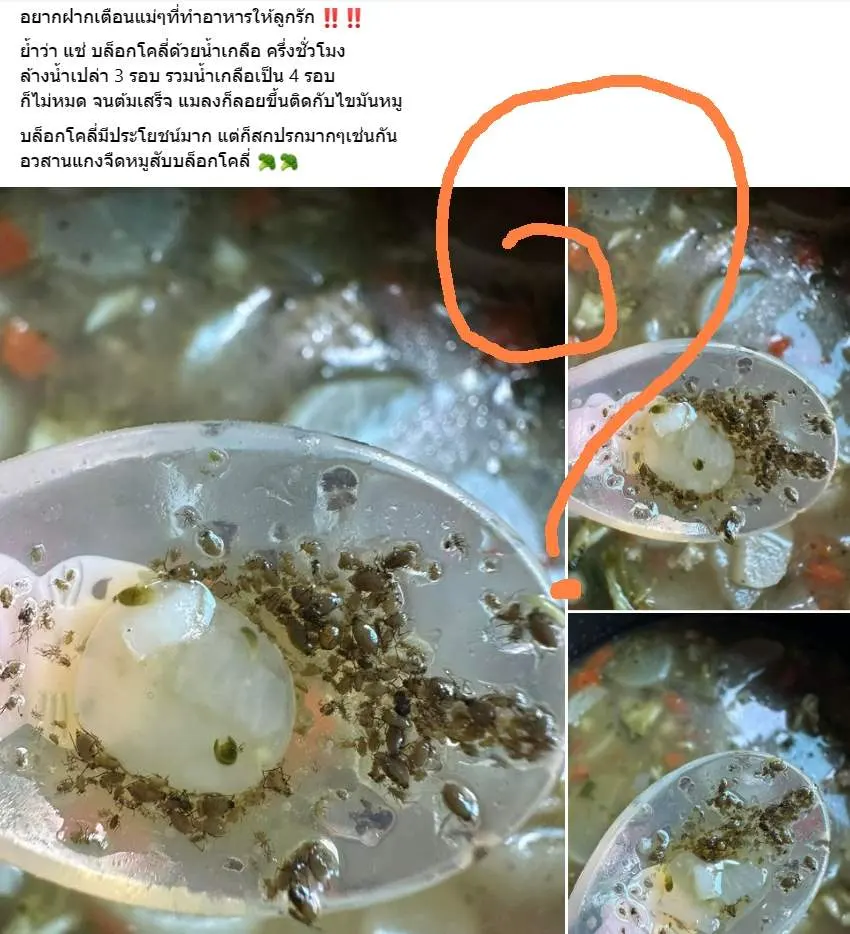 โดยระบุว่า "อยากฝากเตือนแม่ๆที่ทำอาหารให้ลูกรัก ‼️‼️ ย้ำว่า แช่ บร็อคโคลี่ด้วยน้ำเกลือ ครึ่งชั่วโมง ล้างน้ำเปล่า 3 รอบ รวมน้ำเกลือเป็น 4 รอบ ก็ไม่หมด จนต้มเสร็จ แมลงก็ลอยขึ้นติดกับไขมันหมู บร็อคโคลี่มีประโยชน์มาก แต่ก็สกปรกมากๆเช่นกัน อวสานแกงจืดหมูสับบร็อคโคลี่ 🥦🥦" !?