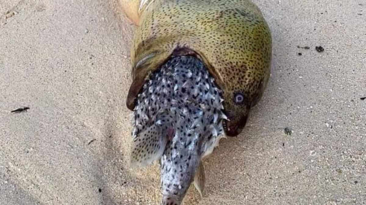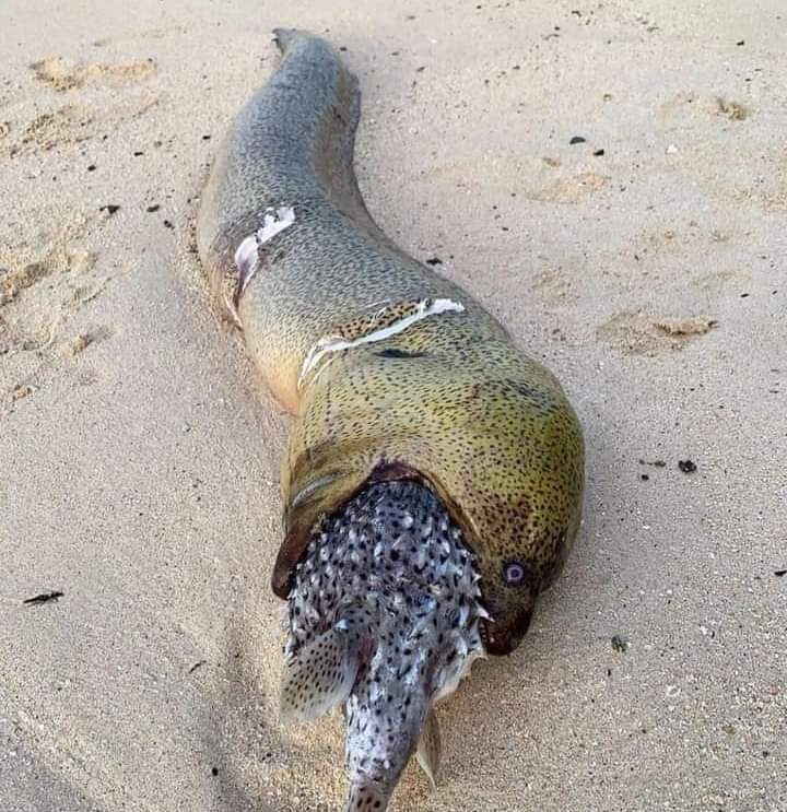 ภาพปลาไหลเมอร์เรย์ผู้โชคร้าย เสียชีวิตขณะกินปลาปักเป้าที่พองตัวคาปาก กลืนก็ไม่เข้าคายก็ไม่ออก เพราะมันพยายามจะกินปลาปักเป้า