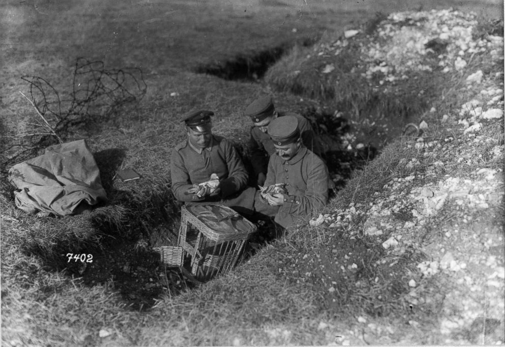 กองทัพเยอรมันยังใช้นกพิราบเป็นพาหะ ที่นี่ทหารเยอรมันสองคนในแนวรบด้านตะวันตกถูกพบเห็นพร้อมกับนกพิราบ รูปถ่าย: กระทรวงสงครามเยอรมัน
