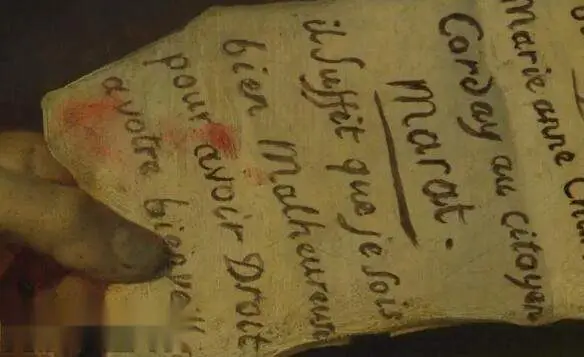การโกหกครั้งที่สามคือจดหมายที่ Marat ถืออยู่ในมือหลังจากที่เขาเสียชีวิต เดวิดประดิษฐ์เนื้อหาของจดหมายในภาพวาดเพื่อให้เต็มไปด้วยความอบอุ่น อันที่จริง สิ่งที่ Marat ทิ้งไว้ให้โลกก่อนที่เขาจะเสียชีวิตคือรายชื่อการประหารชีวิต Mara กำจัดให้สิ้นซาก ตามที่คอร์เดย์กล่าวในศาล เธอฆ่าคนคนหนึ่งเพื่อช่วยชีวิตคน 100,000 คน และคอร์เดย์ฆ่ามารัตเพื่อป้องกันการฆ่าอย่างโหดเหี้ยม