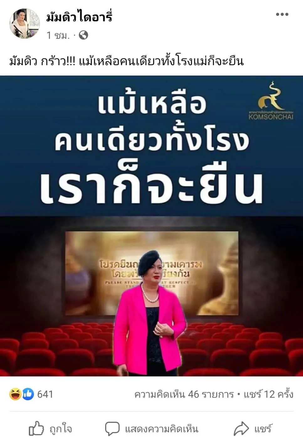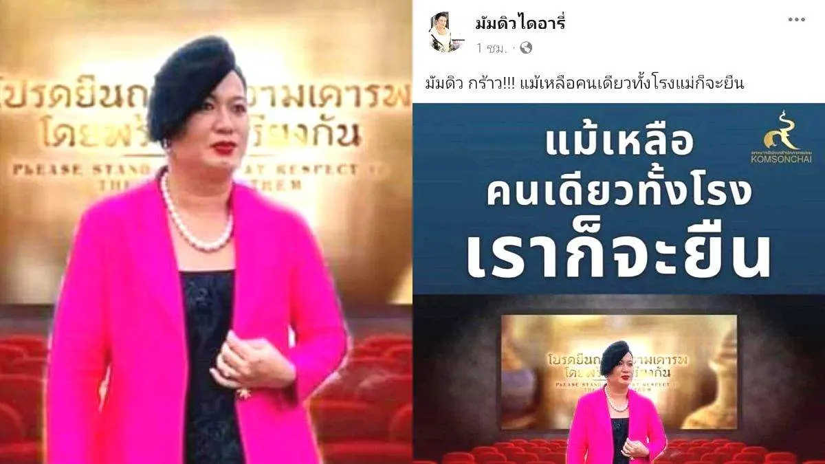 มัมดิวไดอารี่” อินฟลูเอนเซอร์ดัง ที่ชอบแต่งกายด้วยผ้าไทย โพสต์ปลุกใจชาวเรา เชิญชวนให้ทุกคนยืนในโรงหนังแม้เหลือคนเดียวก็จะยืน