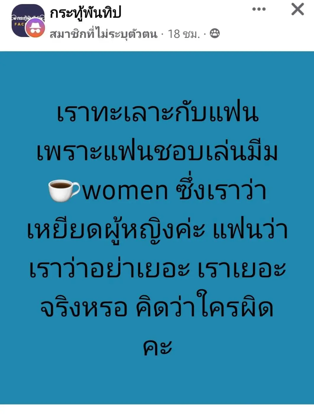 เราทะเลาะกับแฟน เพราะแฟนชอบเล่นมีม ☕women ซึ่งเราว่าเหยียดผู้หญิงค่ะ แฟนว่าเราว่าอย่าเยอะ เราเยอะจริงหรอ คิดว่าใครผิดคะ