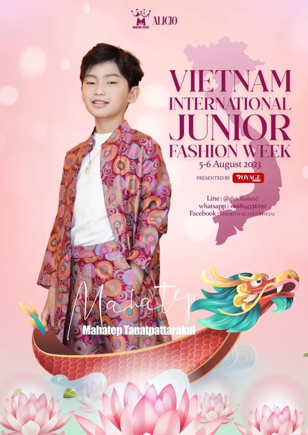 Runway “VIETNAM INTERNATONAL JUNIOR FASHION WEEK 2023 ..เมื่อวันที่ 5-6 สิงหาคม 2566 ณ.Hinoi Museum ภายใต้แบรนด์ “ALICIO Thailand x Madame house เป็นการเปิดประสบการณ์การเดินแบบครั้งแรกในเวที แฟชั่นวีคที่เวียดนามใน “concept ผ้าปาเต๊ะ ที่เป็นอัคลักษณ์ ของจังหวัดภาคใต้ ของประเทศไทย ที่มีการออกแบบตัดเย็บ ด้วยฝีมือดีไซน์เนอร์ไทย “ที่ใครรู้จักในนาม บ้านแม่มาดาม” และเป็นการเปิดตัว แบรนด์มหาเทพผ้าไทย บนเวที VIETNAM INTERNATONAL JUNIOR FASHION WEEK 2023 ในครั้งนี้ด้วย และปลายปีน้องมหาเทพยังได้รับเกียรติร่วมงาน Fashion week ในต่างประเทศอีกด้วย ฝากเป็นกำลังใจให้ น้องมหาเทพ และ แบรนด์มหาเทพ “ผ้าไหมไทยดังไกลทั่วโลก ด้วยนะครับ “