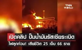 สำนักข่าวรอยเตอร์ เปิดคลิปจากโซเชียลมีเดีย ไฟกำลังลุกท่วมปั๊มน้ำมันหลังเกิดระเบิด ในเมืองมาคัชคาลา ทางใต้ของรัสเซียเมื่อวานนี้ (14 ส.ค.) โดยอ้างสำนักข่าว Interfax ของรัสเซียรายงานมีผู้เสียชีวิต 25 คน รวมถึงเด็ก 3 คน บาดเจ็บ 66 คน ซึ่งคลิปจากโซเชียล มีเดีย เป็นภาพไฟกำลังลุกท่วมปั๊มน้ำมัน และมีการระเบิดเกิดขึ้นหลายครั้งท่ามกลางกองเพลิง