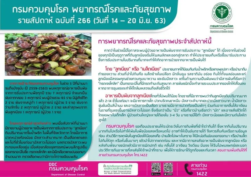 กรมควบคุมโรค เผยแพร่พยากรณ์โรคและภัยสุขภาพ ฉบับที่ 266 เตือนประชาชนระวังป่วยด้วยโรคอาหารเป็นพิษจากการรับประทานพืช โดยเฉพาะ "ลูกเนียง" ที่ในช่วงนี้เริ่มให้ผลผลิตและออกสู่ตลาด หากรับประทานในปริมาณที่มากเกินไป อาจทำให้เกิดอาการป่วยจากอาหารเป็นพิษได้ ซึ่งระบุว่า จากการเฝ้าระวังของกรมควบคุมโรคในช่วง 5 ปีที่ผ่านมา ตั้งแต่ปี 2559-2563 พบเหตุการณ์อาหารเป็นพิษจากการรับประทานพืชทุกปี รวม 7 เหตุการณ์ จำแนกเป็นพิษจากกลอย 3 เหตุการณ์ พบผู้ป่วยรวม 65 ราย มีผู้เสียชีวิต 2 ราย พิษจากสบู่ดำ 1 เหตุการณ์ ผู้ป่วย 5 ราย พิษจากว่านจักจั่น 2 เหตุการณ์ มีผู้ป่วย 2 ราย