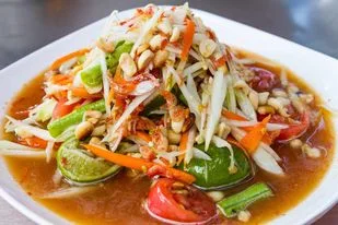 เป็นอาหารปรุงมาจากการทำตำส้ม คือการทำให้เปรี้ยว ในลาวจะเรียกว่าตำหมากหุ่ง ปรุงโดยนำมะละกอดิบที่สับแล้วฝานหรือขูดเป็นเส้นมาตำในครกเป็นหลัก พร้อมด้วยวัตถุดิบอื่น ๆ คือ มะเขือเทศลูกเล็ก มะเขือสีดา มะเขือเปราะ พริกสดหรือพริกแห้ง ถั่วฝักยาว กระเทียม และปรุงรสด้วยน้ำตาลปี๊บ น้ำปลา และมะนาว