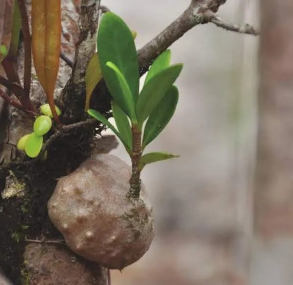 ลักษณะทางพฤกษศาสตร์ : ไม้กาฝากเกาะอาศัยไม้อื่น สูง 25 - 60 ซม. โคนต้นโป่งพองคล้ายหัว ใบ เดี่ยว เรียงตรงข้ามรูปวงรีหรือรูปใบหอก กว้าง 2 - 7 ซม. ยาว 5 - 15 ซม. หูใบอยู่ระหว่าก้านใบ ดอกช่อ ออกที่กิ่งกลีบดอกสีขาว ผลสดรูปไข่กลับ เมื่อสุกสีส้ม