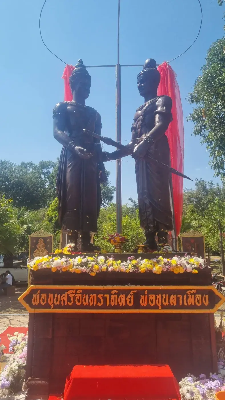 พระรูปปฏิมากรรมพ่อขุนผาเมือง และ พ่อขุนศรีอินทราทิตย์ (พ่อขุนบางกลางหาว) พระสหาย ณ วัดโบสถ์ เมืองโบราณบางขลัง ตําบลเมืองบางขลัง อําเภอสวรรคโลก จังหวัดสุโขทัย ขอบพระคุณภาพโดย Meen Moreda ๐๖ กุมภาพันธ์ ๒๕๖๙