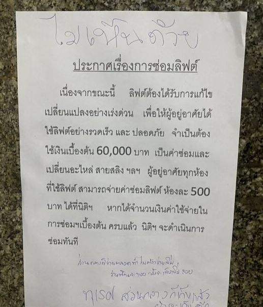 - ลิฟต์คอนโดแห่งหนึ่งย่านลาดพร้าวเสีย ทางนิติขอเก็บค่าส่วนกลางเพิ่มอีกห้องละ 500 บาท เพื่อนำไปซ่อมลิฟต์