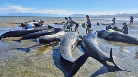 น่าเศร้าใจ หลังวาฬ 55 ตัวถูกคลื่นซัดขึ้นฝั่ง ที่นิวซีแลนด์