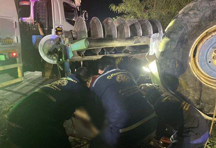 รถไถเสียหลักตกข้างทาง! พลิกคว่ำทับร่างคนขับ คอหักเสียชีวิตคาที่