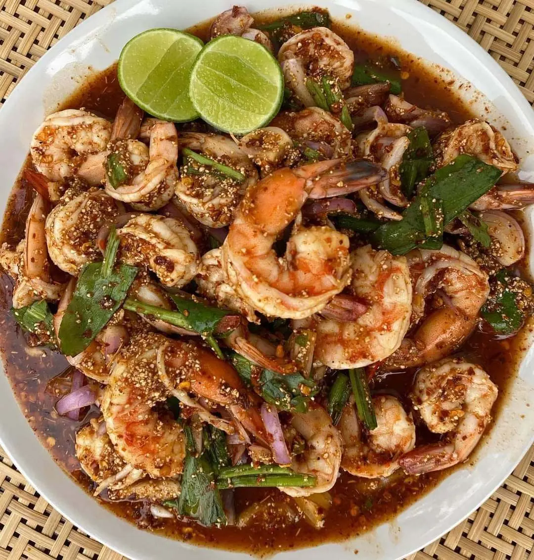 - ใส่กุ้งที่ลวกแล้วลงในชามผสม ใส่ข้าวคั่ว พริกป่น น้ำมะนาว และน้ำปลาแล้วคลุกเคล้าให้เข้ากัน