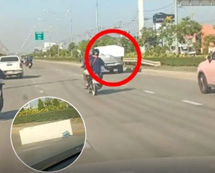 ในระหว่างนั้นมีรถเก๋งไฟฟ้า สีชมพู ขับตามหลังอยู่ เมื่อรถเก๋งขับเข้าไปใกล้ๆ ตู้ไม้ก็หล่นลงมาจากรถกระบะ โชคดีที่รถเก๋งสามารถเบรกและหักหลบทัน ทำให้ไม่เกิดอุบัติเหตุ