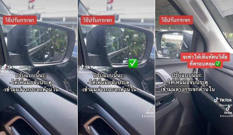 ล่าสุด ได้มีบัญชีผู้ใช้ TikTok ที่ชื่อว่า @isuzuhat ได้ออกมาทำการโพสต์แชร์คลิปเกี่ยวกับการปรับกระจกรถที่ถูกต้อง โดยได้ระบุข้อความว่า “ปรับกระจกรถที่ถูกต้อง ปรับแบบนี้นะ #มือใหม่หัดขับ #กระจกรถยนต์”
