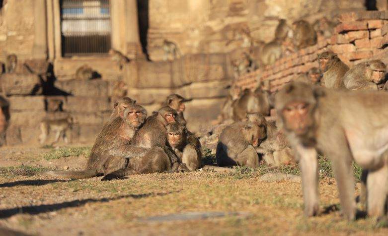 ฝูงลิงลพบุรีออกมานั่งและนอน เพื่อรับไออุ่นจากแสงแดดหน้าพระปรางค์สามยอด