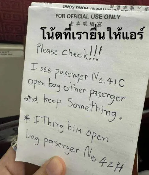 แอร์ได้รับโน้ต และพยักหน้า จากนั้นไม่นานมีแอร์ผู้ชายเดินมาถามผู้โดยสายแถวที่ 42 ว่ามีอะไรหายมั้ย ตอนนั้นเขาก็ยังไม่รู้ตัวบอกว่าไม่มี