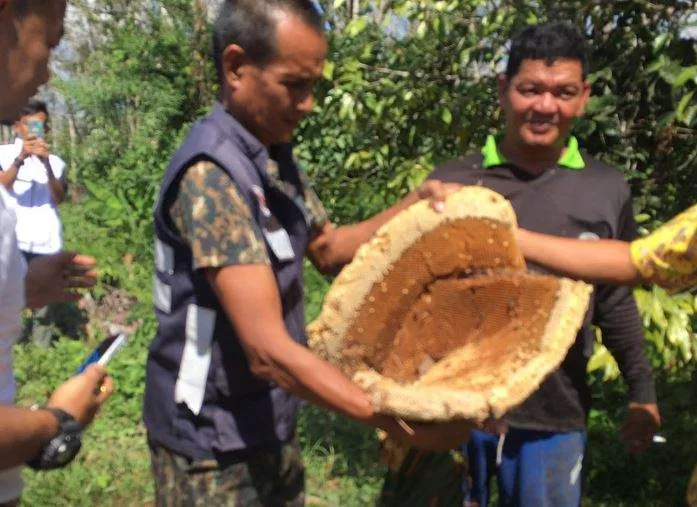 เจ้าหน้าที่จึงประสานผู้เชี่ยวชาญด้านการจับผึ้งให้มาดำเนินการจับรังผึ้ง โดยใช้วิธีทำคบเพลิงไล่ผึ้งก่อนขึ้นไปตัดรังลงมา ซึ่งใช้เวลาเพียง 5 นาที ก็สามารถตัดรังผึ้งลงมาได้อย่างปลอดภัย