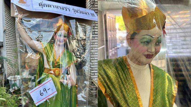 นอกจากนี้ หญิงสาวคนนี้ยังนำถุงพลาสติกขนาดใหญ่มาห่อหุ้มตัวไว้ ราวกับเป็นสินค้าจริง ๆ แถมยังมีแปะป้ายราคาพร้อม ในราคา 69 บาท นอกจากนี้ด้านบนยังมีกระดาษเขียนระบุว่า "ตุ๊กตานางรำ รุ่นวีนฉ่ำ!!"
