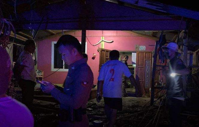 ที่เกิดเหตุ ม.2 ต.หนองพันทา อ.โซ่พิสัย จ.บึงกาฬ เพลิงได้สงบลงแล้ว มีร่องรอยเพลิงไหม้บริเวณหน้าบ้านเป็นหญ้าคาที่ใช้ทำเป็นหลังคาไหม้บางส่วน