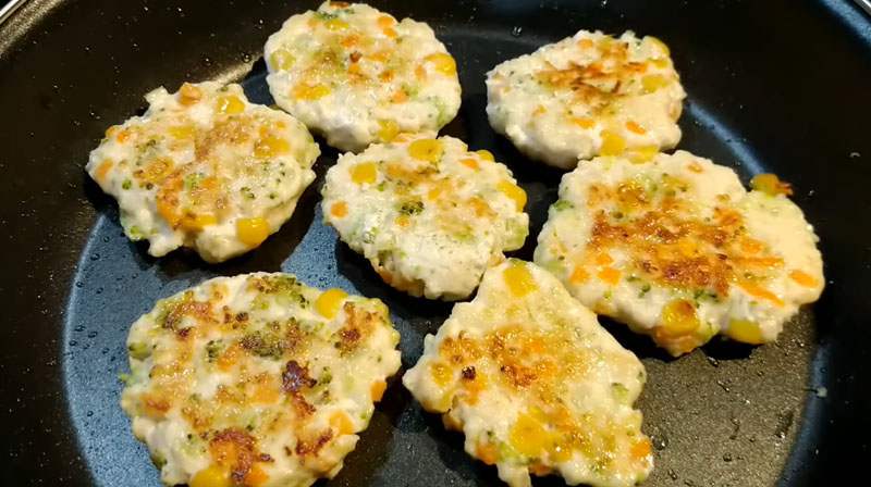 3. เมื่อส่วนผสมเริ่มเซตตัว ใช้ตะหลิวพลิกกลับทอดอีกด้านจนกระทั่งสุกทั่วกัน เนื้ออกไก่สุกเปลี่ยนเป็นสีเหลืองสวย เป็นอันเสร็จ