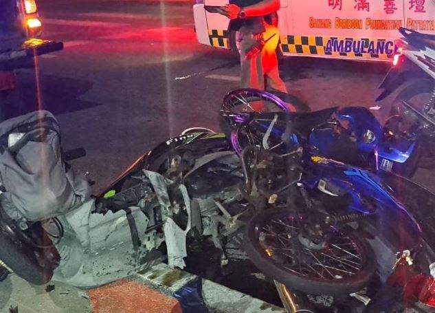 ที่เกิดเหตุพบรถจักรยานยนต์ 2 คัน สภาพเสียหายยับเยิน คันแรกเป็นรถจักรยานยนต์ยามาฮ่า ฟีโน่ สีเขียว ทะเบียน ชลบุรี มีนายอรรถกรณ์ อายุ 27 ปี เป็นคนขี่ ได้รับบาดเจ็บสาหัส ส่วนอีกคันเป็นรถจักรยานยนต์ ฮอนด้าเวฟ 110 สีน้ำเงิน ไม่ติดแผ่นป้ายทะเบียน สภาพแต่งซิ่งท่อดัง มีชายไทย อายุประมาณ 20 ปี เป็นคนขี่ นอนจมกองเลือด อยู่ในอาการโวยวาย
