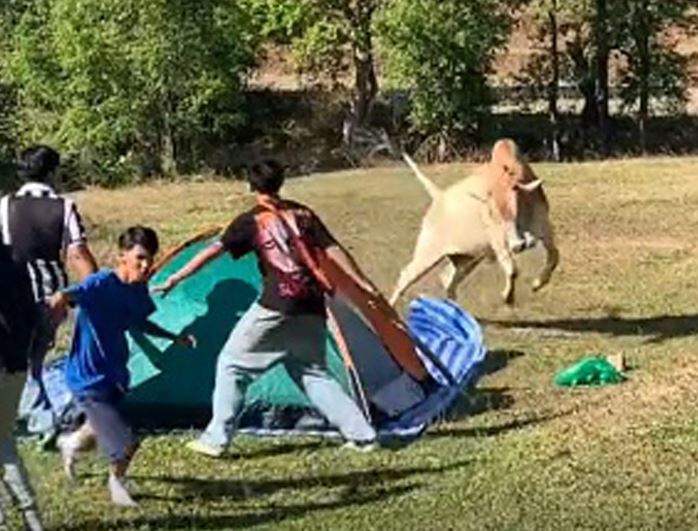 นึกว่าโปรของที่พัก วัวคลั่งไล่ขวิดนักท่องเที่ยว ลานกางเต็นท์
