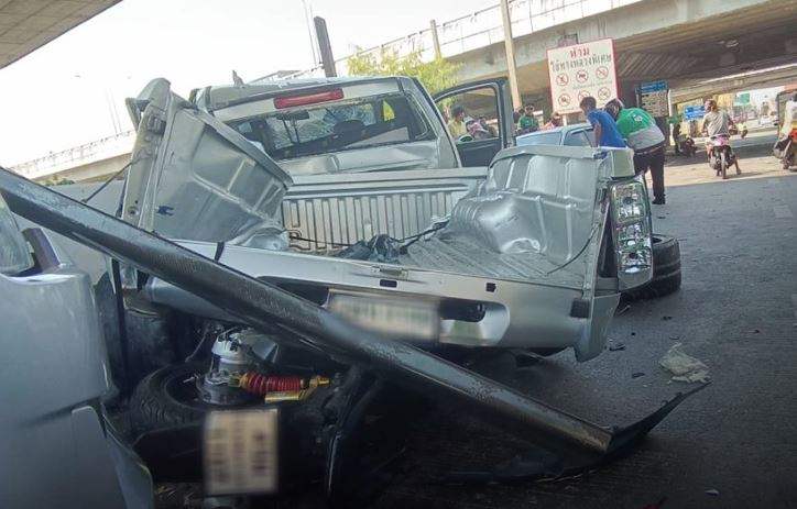 รถชนบริเวณใต้สะพาน รถของคู่กรณีระหว่างรถกระบะและรถเก๋ง มีการขับรถปาดกันไปมาบนสะพานขาออก ถนนอ่อนนุช ก่อนจะมาเสียหลักชนรถจักรยานยนต์กระเด็นข้ามเกาะไปชนกับรถของผู้เสียหายอีกหลายคัน จนทำให้มีผู้ได้รับบาดเจ็บหลายราย รวมทั้งมีผู้เสียชีวิตด้วย