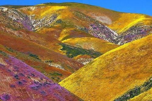 ภาพที่เราได้เห็นนี้เป็นเนินเขาสีสันสวยงามนี้ตั้งอยู่ในพื้นที่ The Temblor Range ภายใน Carrizo Plain National Monument รัฐแคลิฟอร์เนีย สหรัฐอเมริกา ฝนที่ตกมาก่อนหน้านี้ส่งผลให้ดอกไม้ป่านานาพันธุ์บริเวณเนินเขาแห่งนี้ไม่ว่าจะเป็นสีม่วง สีเหลือง สีส้ม ที่พร้อมใจกันเบ่งบานอวดโฉมความงามต้อนรับนักท่องเที่ยวให้ไปเยี่ยมชม