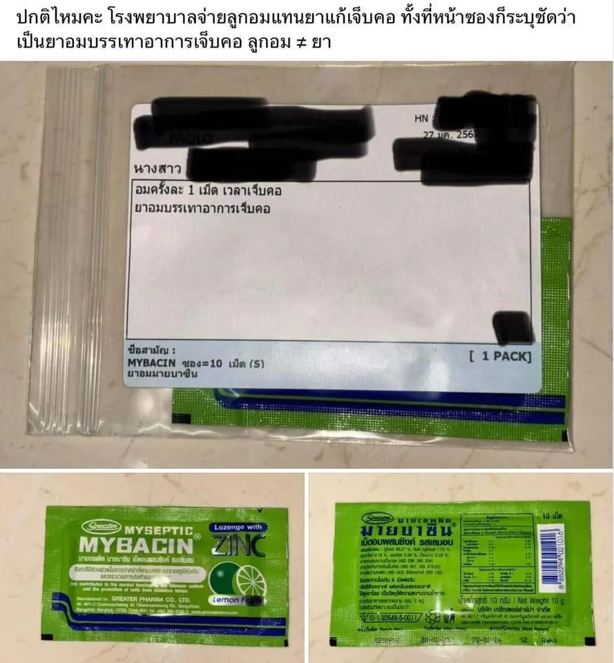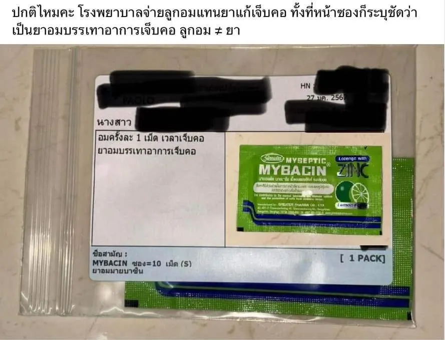 สาวรายหนึ่งขี้สงสัย ไปหาหมอเพราะเจ็บคอแต่กลับได้ยาอมมาแทน พอโพสต์ถามแค่นั้นแหล่ะ งานนี้ก็เจอชาวเน็ตทัวร์ลงฉ่ำเลยจ้า เรื่องเล็กๆ แค่นี้ แต่ก็กลายเป็นประเด็นให้พูดถึงกันอย่างมากมาย เมื่อมีผู้ใช้เฟซบุ๊กรายหนึ่ง ได้ออกมาโพสต์ยาซอง Myseptic Mybacin พร้อมกับถามด้วยว่า “ปกติไหมคะที่โรงพยาบาลจ่ายลูกอมแทนยาแก้เจ็บคอ ทั้งที่หน้าซองระบุชัดว่าเป็นยาอมบรรเทาการเจ็บคอ ลูกอมไม่เท่ากับยา”