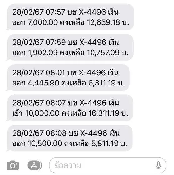 - เช้าวันหนึ่งเธอพบว่ามีข้อความแจ้งเตือนการถอนเงินจากบัญชี 20 ครั้ง
