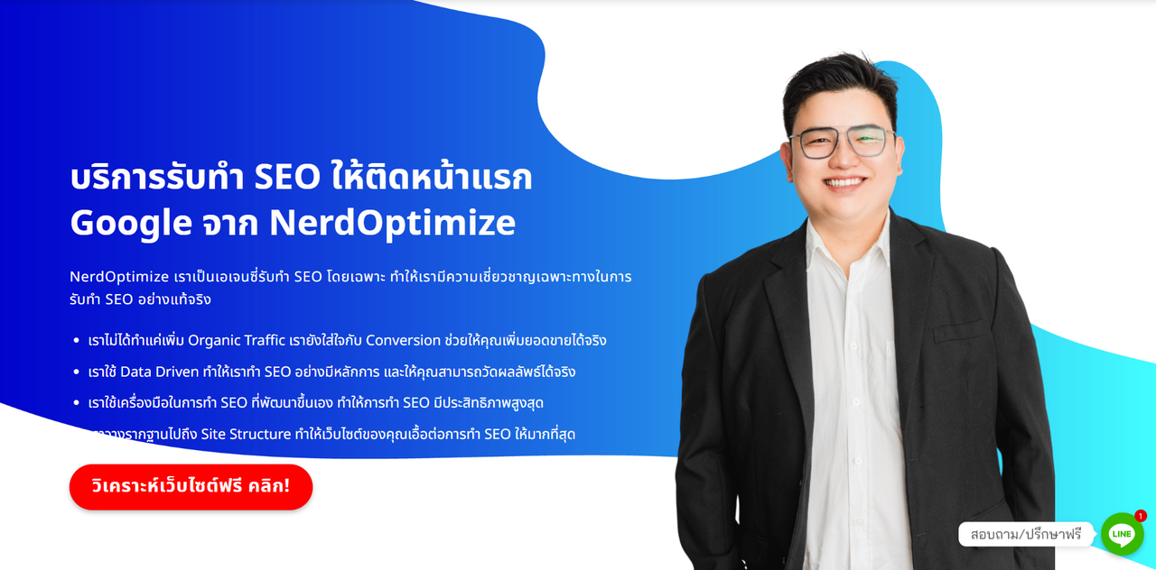 Nerd Optimize บริษัทรับทำ SEO ซึ่งให้บริการด้าน SEO โดยเฉพาะ โดยใช้ data เป็นเครื่องมือสำคัญที่จะช่วยให้ธุรกิจของลูกค้าเติบโตมากยิ่งขึ้น จากประสบการณ์และความเชี่ยวชาญในด้านการทำ SEO ของทีมงานทั้งในเรื่องของการ Research Keyword การวิเคราะห์ข้อมูลผ่าน Tools ต่าง ๆ ไปจนถึงการรับทำ Backlink ทำให้ Nerd Optimize สามารถใช้เครื่องมือได้อย่างมีประสิทธิภาพ สามารถเห็นผลลัพธ์ได้จริง ส่งผลให้บริษัท Nerd Optimize เป็นที่ยอมรับในปัจจุบัน