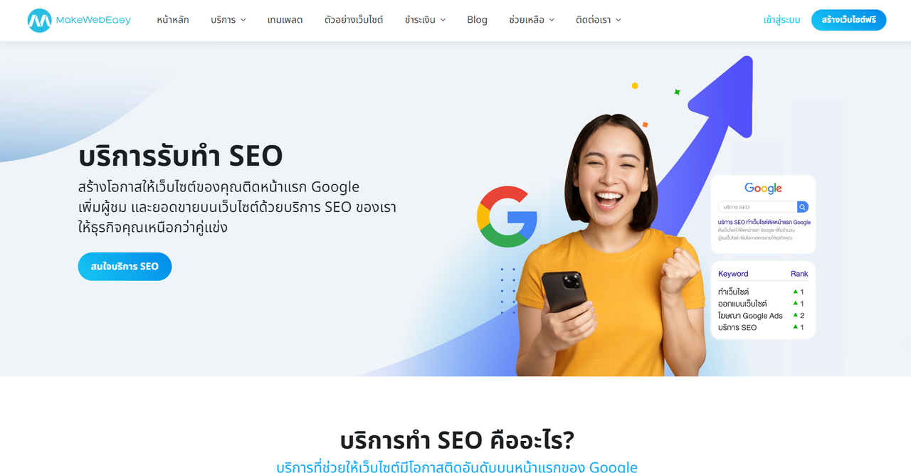 อีกหนึ่งบริษัทรับทำ SEO ที่น่าสนใจไม่แพ้กันคือ MakeWebEasy ซึ่งเป็นบริษัทรับออกแบบ และจัดทำเว็บไซต์ที่ต้องการให้กลุ่มธุรกิจ SME สามารถเติบโตได้ด้วยการสร้างเว็บไซต์ร้านค้าอย่างสะดวก รวดเร็ว ในราคาจับต้องได้ ซึ่งจะมีทั้งในรูปแบบของ template เว็บไซต์สำเร็จรูป หรือจะให้ MakeWebEasy ออกแบบเว็บไซต์ให้ตามโจทย์ของแต่ละธุรกิจก็มีเช่นเดียวกัน