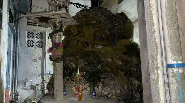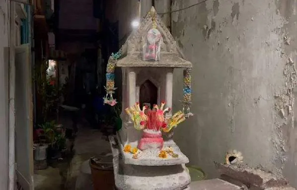 ด้านข้างเจดีย์มีศาลพระภูมิและตุ๊กตานางรำเก่า ๆ วางอยู่ด้วย สังเกตเห็นเหล็กเส้นโผล่มาจากด้านบนของเจดีย์ เอนตัวไปพาดพิงกับกำแพงบ้านของผู้อยู่อาศัย