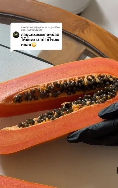 โดยล่าสุด ก็ได้มีบัญชีผู้ใช้ Tiktok ที่ใช้ชื่อ @charmesan ได้ออกมาโพสต์แชร์คลิป และยังตอบคอมเมนต์ด้วยว่า “สอนแกะมะละกอหน่อยได้ไหม เราทำทีไรเละตลอด”