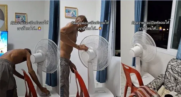 โดยจากในคลิปดังกล่าว ก็ได้เผยให้เห็นว่า คุณพ่อได้เปิดพัดลมแล้วหันหน้าออกไปทางข้างนอกหน้าต่าง