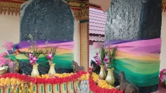หินท่อนใหญ่ถูกผูกไว้ด้วยผ้าเจ็ดสี เป็นที่มาตามตำนานความเชื่อของแต่ละเมือง (แวงใหญ่)
