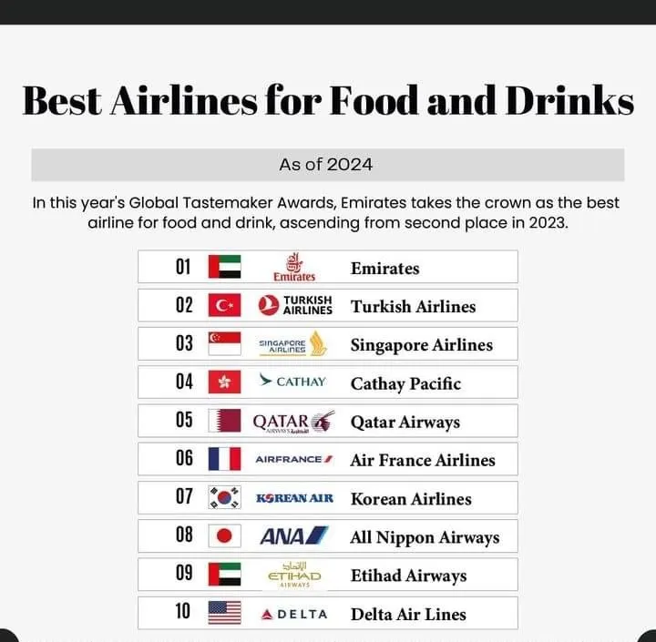 การจัดอันดับสายการบินที่มีอาหารและเครื่องดื่มที่ดีที่สุดในปี 2024 ตามรางวัล Global Tastemaker Awards โดยสายการบิน Emirates ได้รับการยกย่องเป็นอันดับหนึ่งในด้านอาหารและเครื่องดื่ม โดยมีการเปลี่ยนแปลงจากอันดับสองในปี 2023 มาดูรายละเอียดของสายการบินที่ได้รับการจัดอันดับทั้งสิบอันดับดังนี้