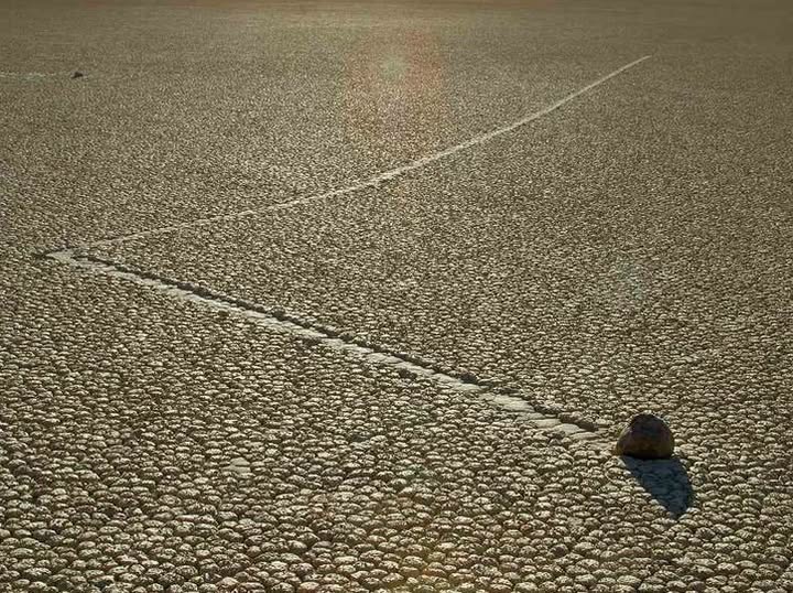 บนพื้นทะเลสาบแห้งที่เรียกว่า Racetrack Playa พื้นที่ราบเรียบคล้าย "ลู่วิ่ง" หินหลากขนาด ตั้งแต่ก้อนเล็กเบาไปจนถึงก้อนใหญ่หนักหลายร้อยกิโลกรัม ทิ้งร่องรอยการเคลื่อนที่ที่ชัดเจนบนผิวดิน บางร่องรอยลากยาวเป็นระยะทางหลายสิบเมตร โดยไม่มีคำอธิบายที่ชัดเจนในตอนแรกว่า พวกมันเคลื่อนที่ไปได้อย่างไร