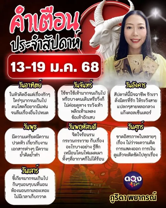 คำเตือนประจำสัปดาห์ 13-19 ม.ค. 68 by ภูริดา พยากรณ์