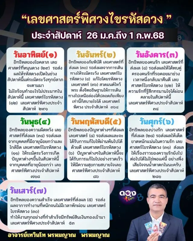 “เลขศาสตร์พิศวงไขรหัสดวง ” ประจำสัปดาห์ 26 ม.ค.ถึง 1 ก.พ.68 “ตัวเลข” ที่เกี่ยวข้องกับดวงวันเกิดประจำสัปดาห์ พยากรณ์โดย อาจารย์เทวินโท พรหมญาณ