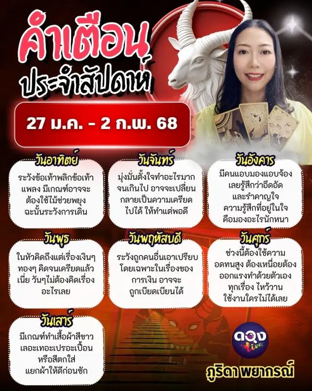 คำเตือนประจำสัปดาห์ 27 ม.ค.-2 ก.พ. 68 by ภูริดา พยากรณ์
