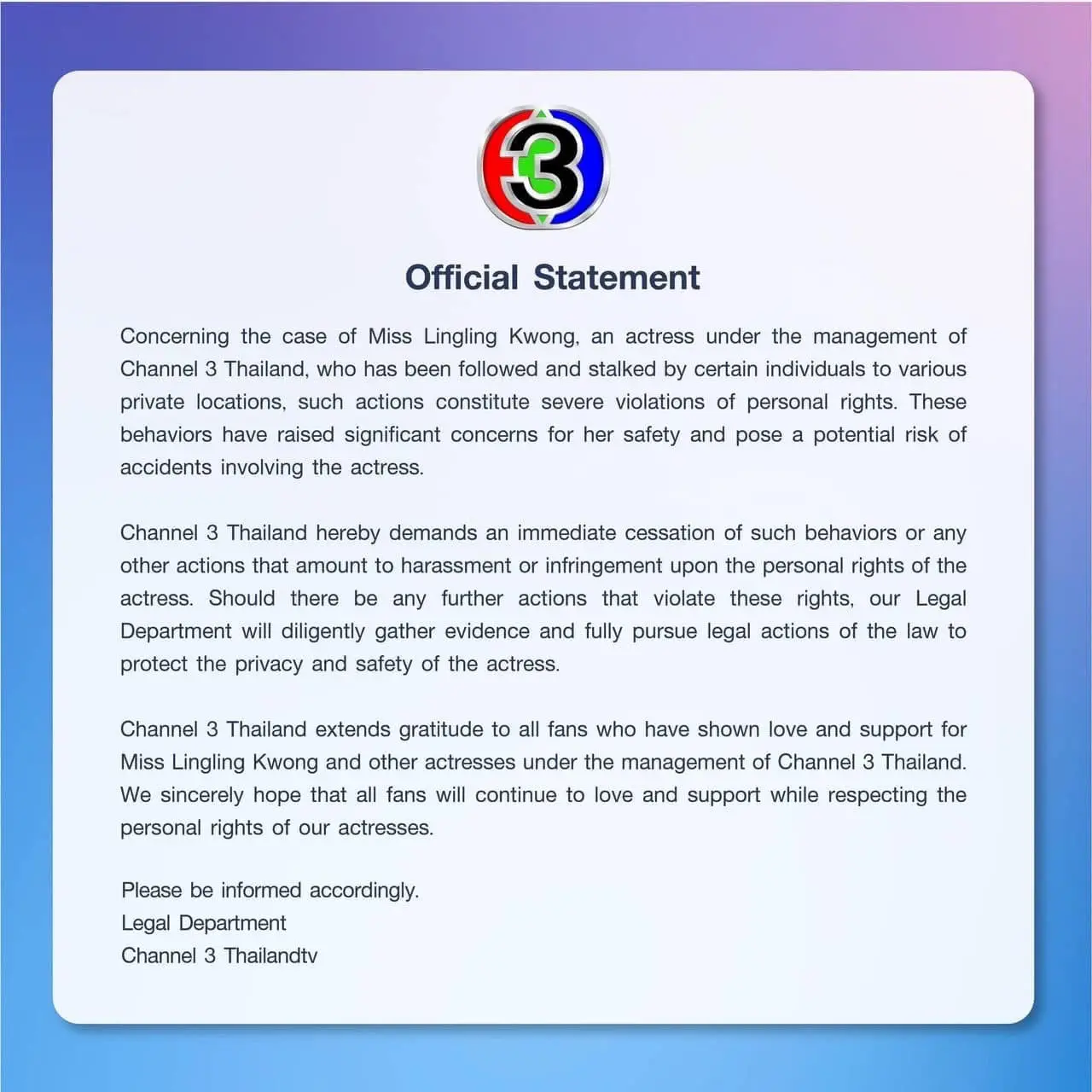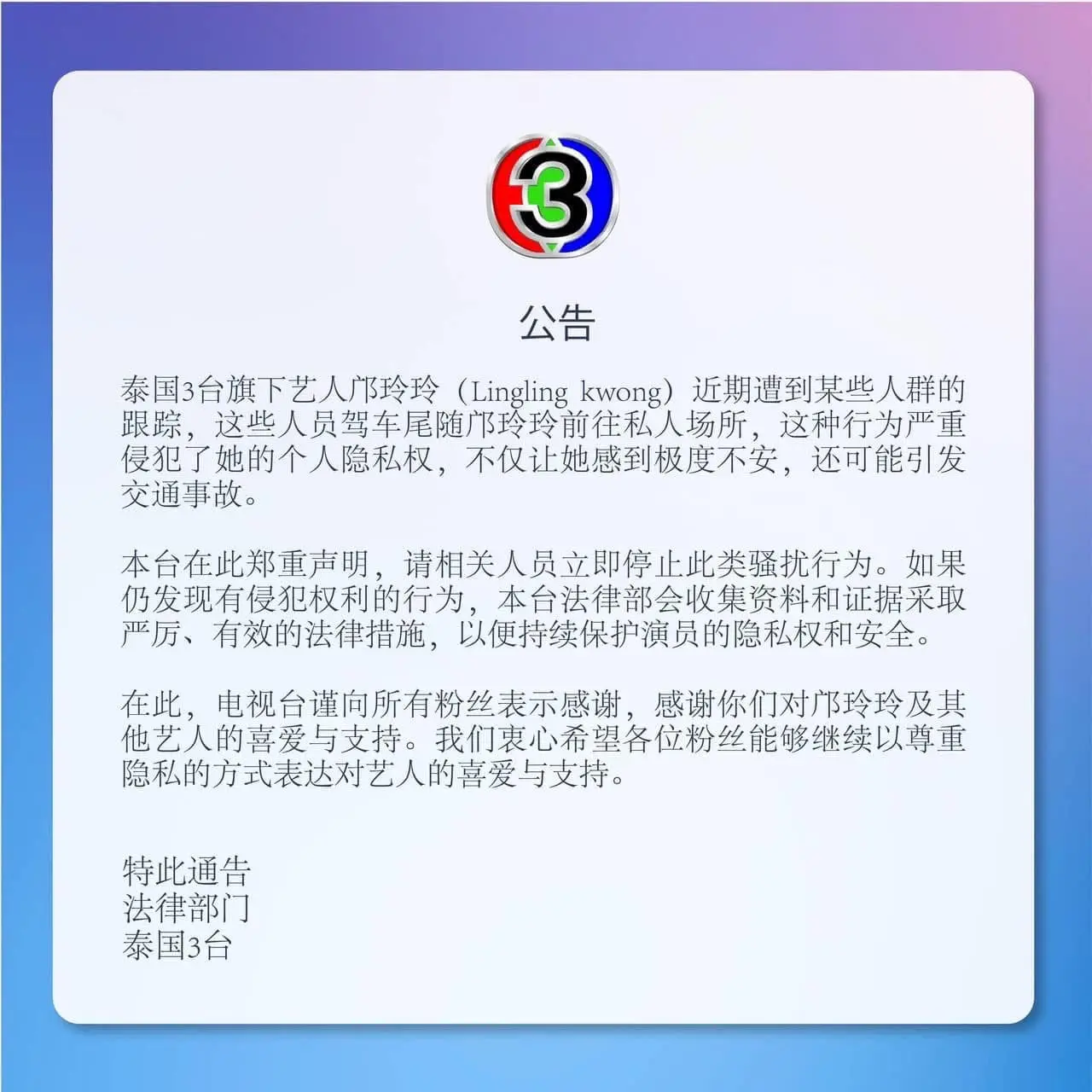 👉“กรณีนักแสดงในสังกัดสถานีโทรทัศน์ไทยทีวีสีช่อง 3 คุณหลิงหลิง คอง ถูกบุคคลบางกลุ่มสะกดรอยตามและขับรถตามไปยังสถานที่ต่าง ๆ อันเป็นพื้นที่ส่วนตัว ซึ่งถือเป็นการกระทำที่ละเมิดต่อสิทธิส่วนบุคคลอย่างร้ายแรง สร้างความวิตกกังวลถึงความไม่ปลอดภัยและอาจทำให้เกิดอุบัติเหตุต่อตัวนักแสดงได้