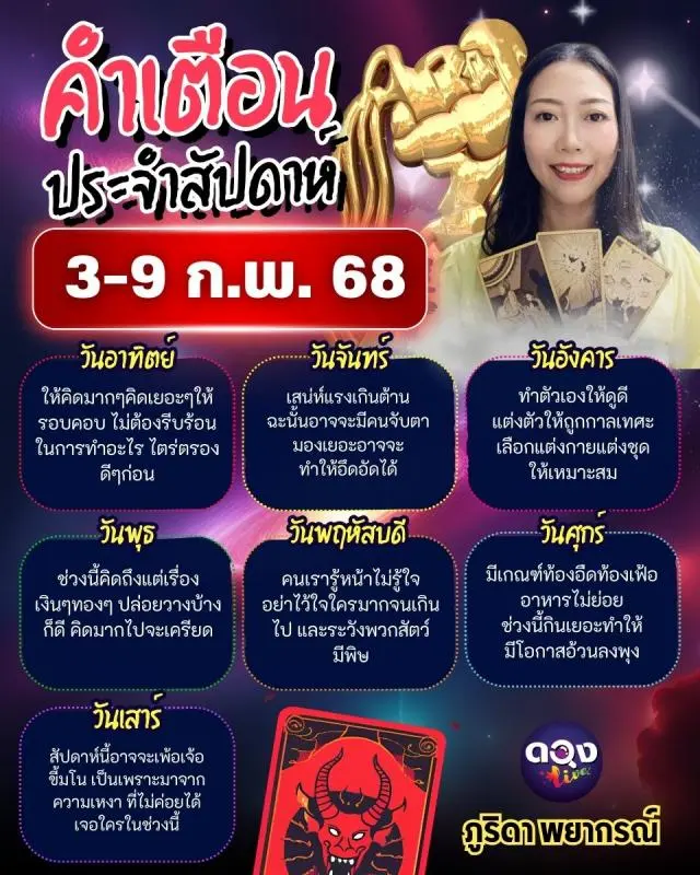คำเตือนประจำสัปดาห์ 3-9 ก.พ. 68 by ภูริดา พยากรณ์