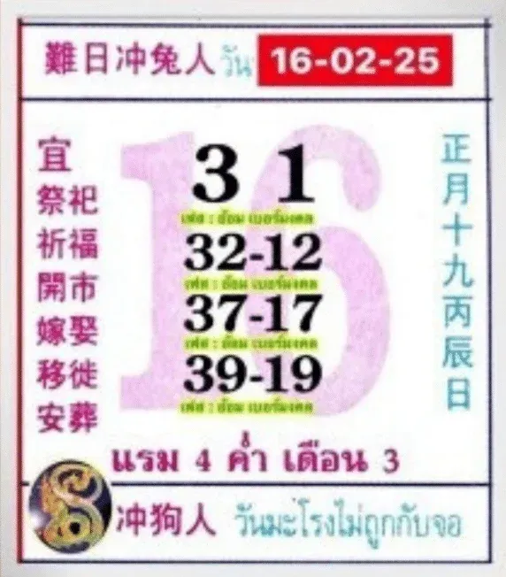 เลขเด็ด ปฏิทินจีน 16/02/68