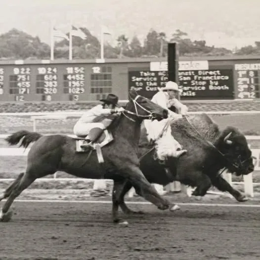 One Fast Buffalo! ภาพเมื่อวันที่ 4 มีนาคม 1989 "ฮาร์วีย์" ควายป่าได้ลงแข่งขันครั้งแรกที่แคลิฟอร์เนียที่สนามโกลเดนเกต โดยมี ที.ซี. ธอร์สเตนสัน เจ้าของและผู้ฝึกสอนเป็นผู้ขี่ "ฮาร์วีย์" เอาชนะม้า "ทูอายด์เบิร์ต" ม้าควอเตอร์ฮอร์สที่ แจ็ก คาเอเนล เป็นผู้ขี่ด้วยระยะห่างครึ่งช่วงตัวในการวิ่ง 110 หลาบนสนามโกลเดนเกตฟิลด์ ควายป่าอายุ 8 ขวบน้ำหนัก 2,000 ปอนด์ตัวนี้ทำเวลาได้ 9.4 วินาที โดยเป็นชัยชนะครั้งที่ 21 จากการลงแข่งขัน 26 ครั้ง