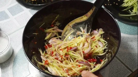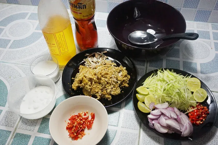 2. ปรุงน้ำยำ – ผสมน้ำมะนาว น้ำปลา น้ำตาลปี๊บ และพริกขี้หนูซอย คนให้เข้ากันจนละลาย