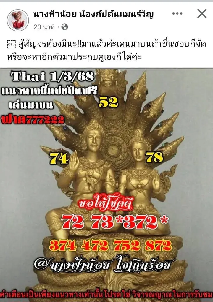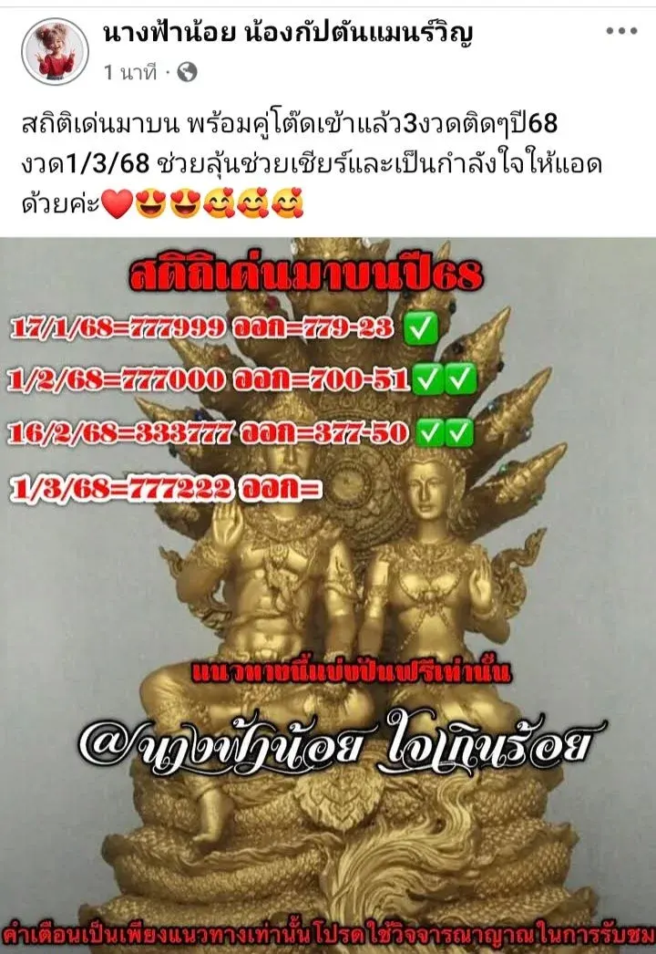 ยังคงย้ำเตือนกันอยู่เสมอว่าด้วยเรื่องราวเหล่านี้เป็นเพียงความเชื่อส่วนบุคคลเท่านั้น พี่น้องคอหวยโปรดใช้วิจารณญาณในการรับชมและรับรู้ข้อมูลอย่างมีสติด้วยครับ ข้อมูลเลขเด็ดหวยเด็ดงวดนี้ ให้ไว้เพื่อเป็นแนวทางในการเสี่ยงโชคและสนับสนุนการซื้อสลากกินแบ่งรัฐบาลที่ถูกต้องตามกฎหมาย ขอให้โชคดี เฮงๆ