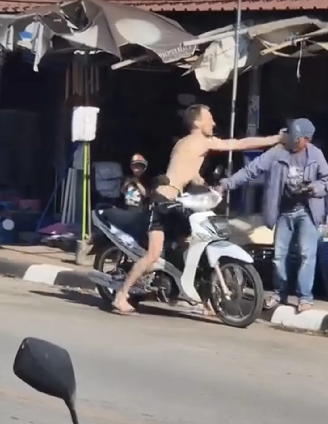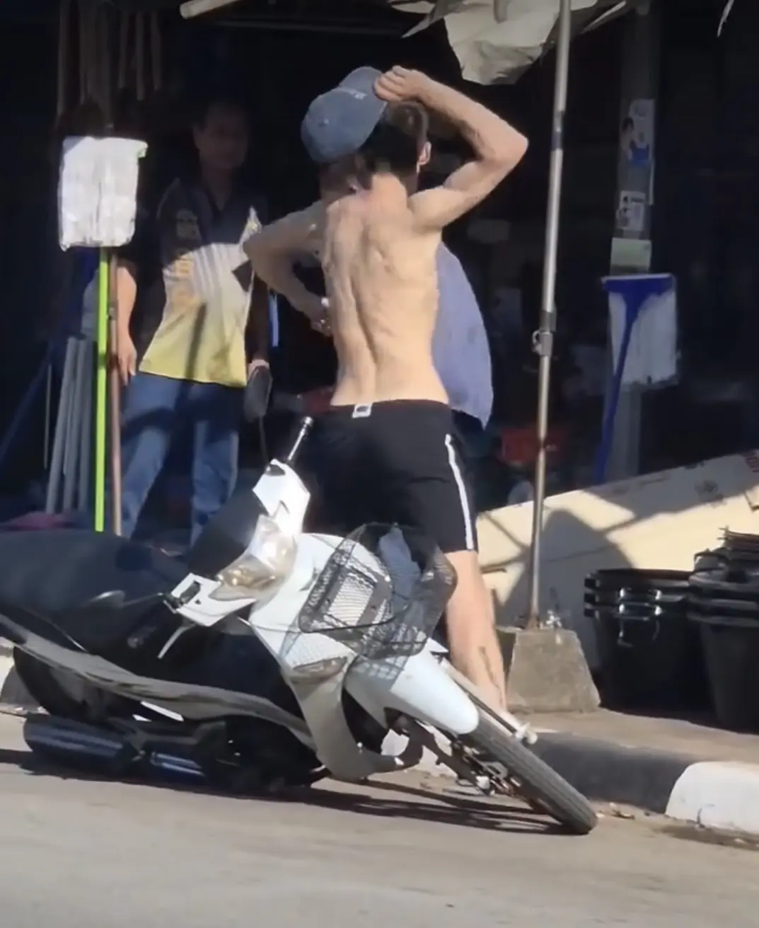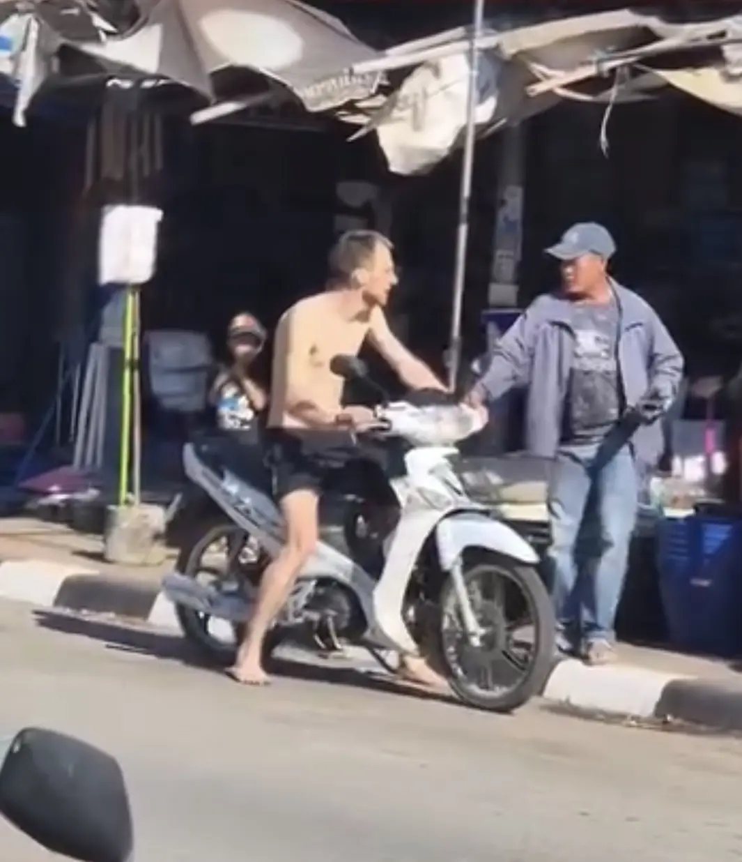 ยังคงมีข่าวไม่จบไม่สิ้นกลับพฤติกรรมสุดเอือมของนักท่องเที่ยวต่างชาติบางคน ย้ำว่าบางคน เเละหนุ่มคนนี่คือหนึ่งในบางคนที่นิสัยเสีย ความเพี้ยนหรือความเมาหรือความเบร่ออะไรไม่รู้ จู่ๆ ก็เดินมาขึ้นคร่อมรถมอเตอร์ไซต์ที่จอดริมถนน ลุงเจ้าของรถที่เห็นจึงมาห้าม พยายามดึงรั้งกันไปมา