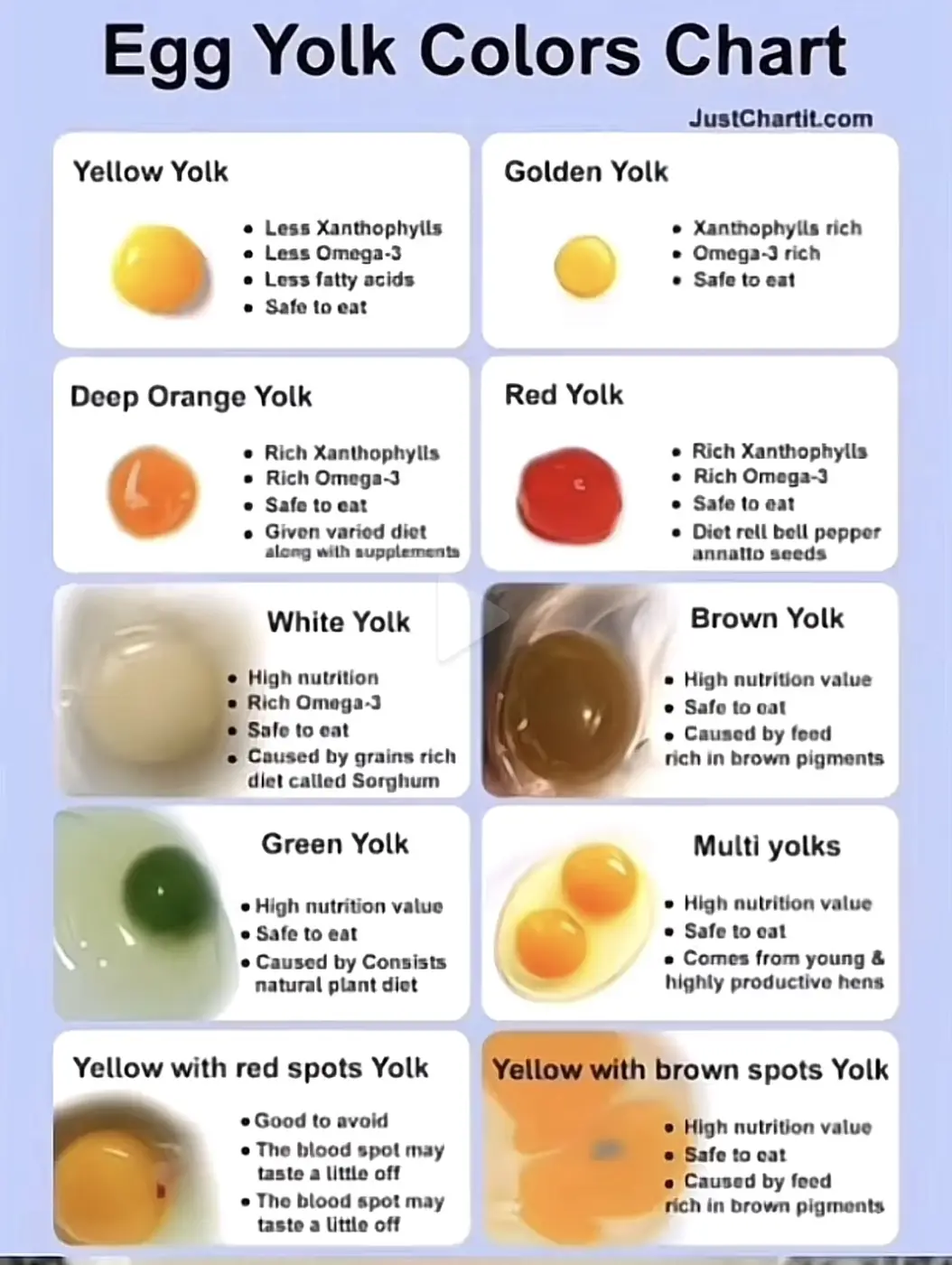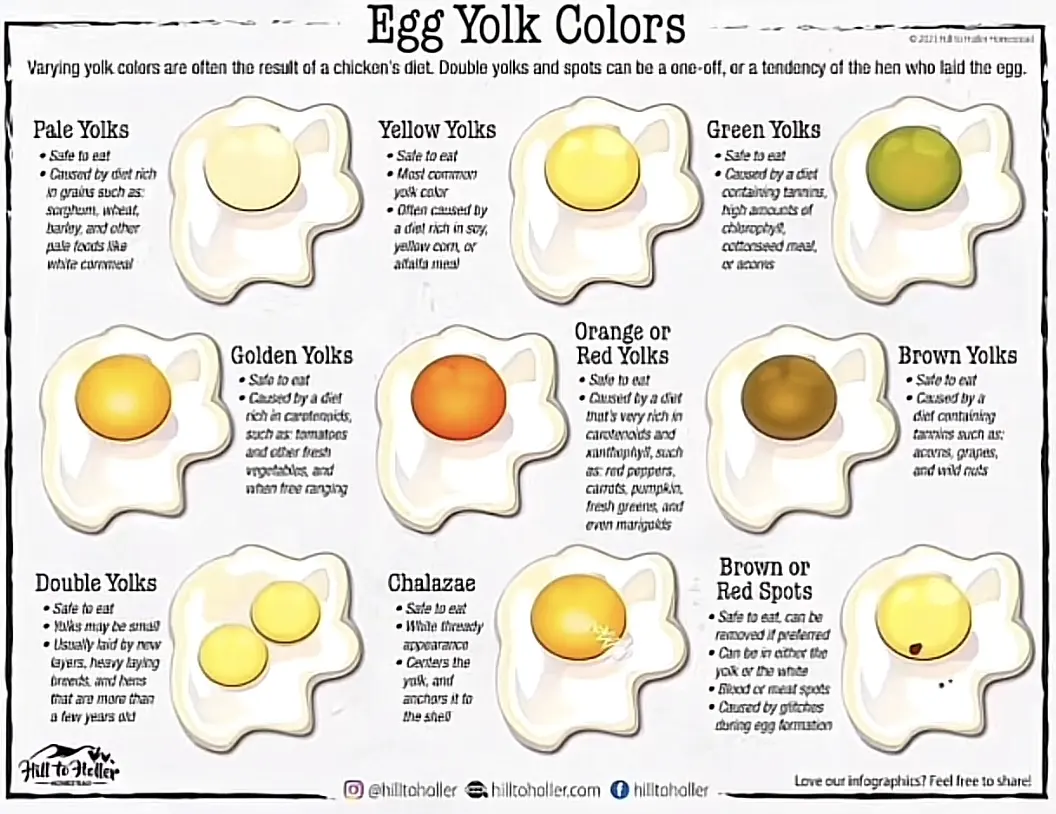 สีของไข่แดงสัมพันธ์กับอาหารของไก่ ไข่แดงที่สีส้มแดง เกิดจากไก่กินอาหารที่มีสารแคโรทีนอยด์ และสารที่อุดมไปด้วยวิตามินเอ ยิ่งผสมในอาหารมากเท่าไร ไข่แดงก็จะเป็นสีส้มแดงมากขึ้นเท่านั้น
