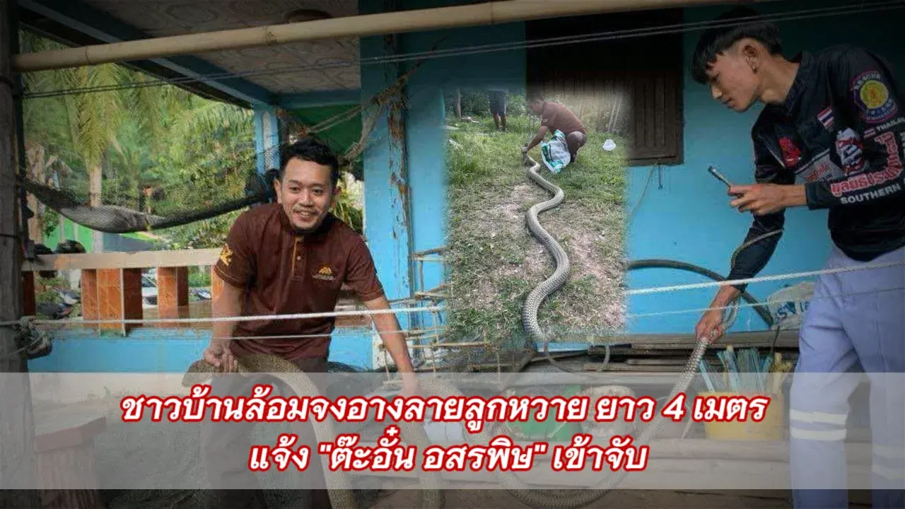 นาทีระทึก! ชาวบ้านล้อมจงอางลายลูกหวาย ยาว 4 เมตร แจ้งต๊ะอั๋น อสรพิษเข้าจับมือเปล่า